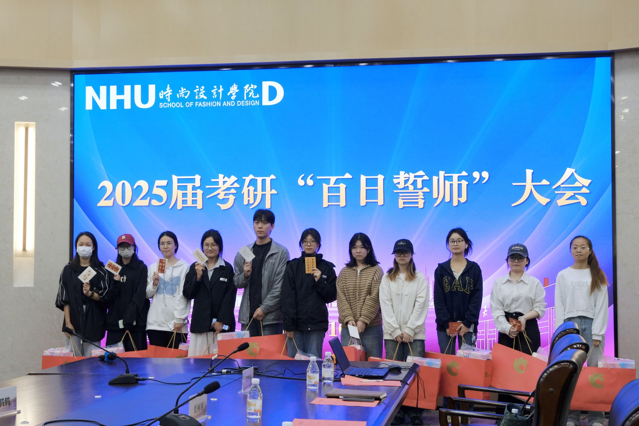 10月10日,时尚设计学院举办2025届考研学生“百日誓师”大会,为助力考研学子坚持跑完考研的“最后百日”征程,学院精心准备了“七个一”考研大礼包,即聆听一场报告、观看一段视频、集体一次宣誓、领取一个福袋、抽取一回盲盒、送上一份祝福、留下一张合影。学院领导班子、各系部主任、考研导师、全体辅导员及近60名2025届考研学子参加活动。